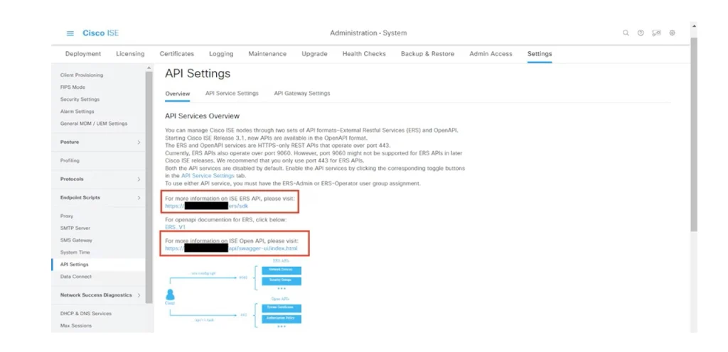 برای کارهای پیشرفتهتر، ISE امکان فراخوانی API نیز دارد. با فعالسازی ERS و OpenAPI در بخش API Settings میتوانید از طریق APIهای REST وضعیت مصرف لایسنس را دریافت کنید.